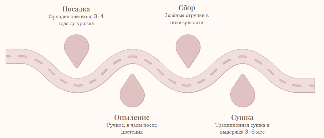 От посадки до первого урожая проходит 3–4 года. Затем стручки проходят долгий процесс подготовки по традиционным малагасийским методам — сушка, ферментация и созревание занимают ещё несколько месяцев.
